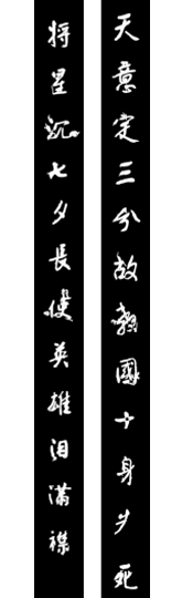 刘湘(1888-19378),四川大邑人,字肤登。四川陆军速成学堂毕业。历任四川陆军第二师师长,第二军军长,川军总司令兼四川省长,国民党第二十一军军长兼四川省政府主席,第七战区司令长官兼第二十三集团军总司令。此联为刘湘率川军出川抗日前夕,专程凭吊庞统祠墓所撰赠,“文革”期间被毁,现为西南美术学院教授黄原补书。
